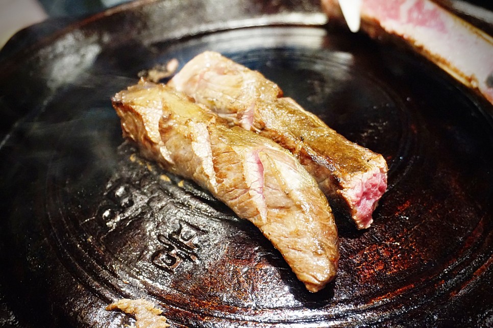 솥뚜껑에 올려서 원하는 굽기만큼 굽고 드시면 됩니다.