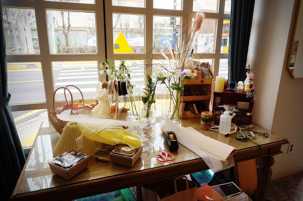 꽃송이들과 포장지가 놓여있어서 직원분께 여쭤보니,