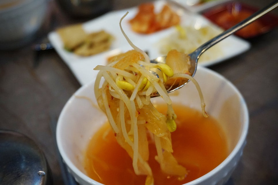 기본찬과 얼큰한 콩나물국이 나오는데요.
