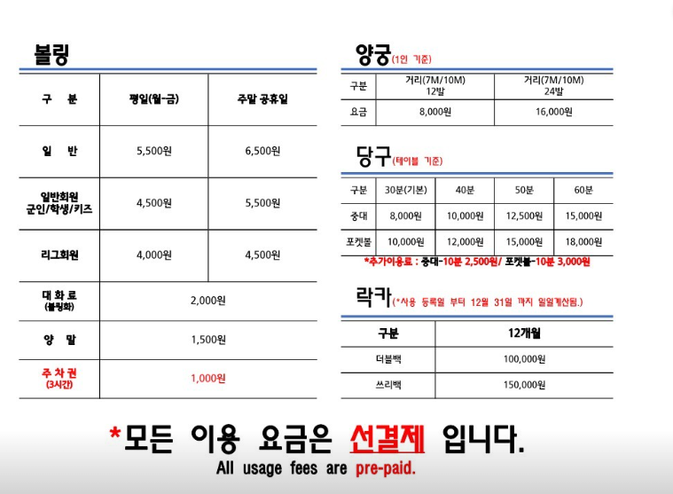 모든 이용 요금은 선결제이며, 볼링, 양궁, 당구도