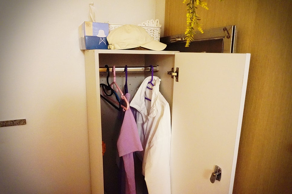 락커룸에 옷을 넣고, 갈아 입습니다.