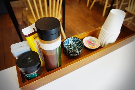 테이블에 종이컵, 머리끈, 돈까스소스, 와사비,