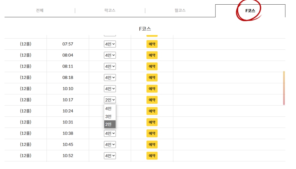 2인 노캐디 라운딩을 예약하시려면 F코스를 누르시고 원하는 시간대에 맞춰 예약해주시면 됩니다. 2인 노캐디 라운딩임에도 불구하고 다양한 시간대👍