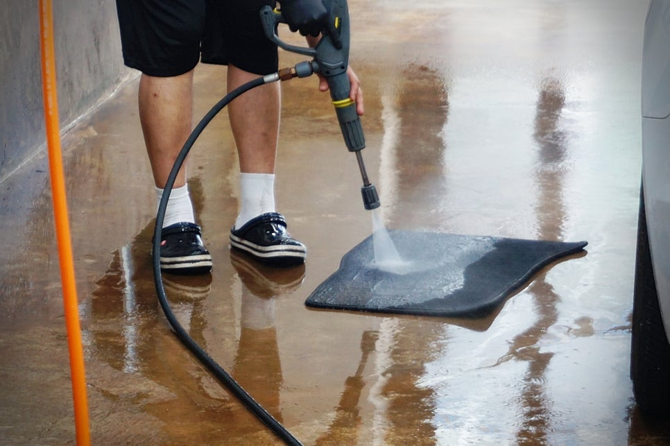 매트를 하나하나 꺼내서 일단 청소기로 흡입하고, 물로 쫙 뿌려준답니다.