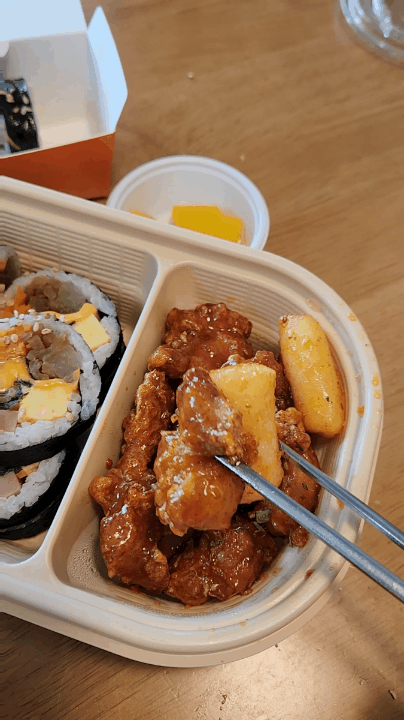 김밥과 닭강정을 함께 담아 혼밥/혼술에 딱인