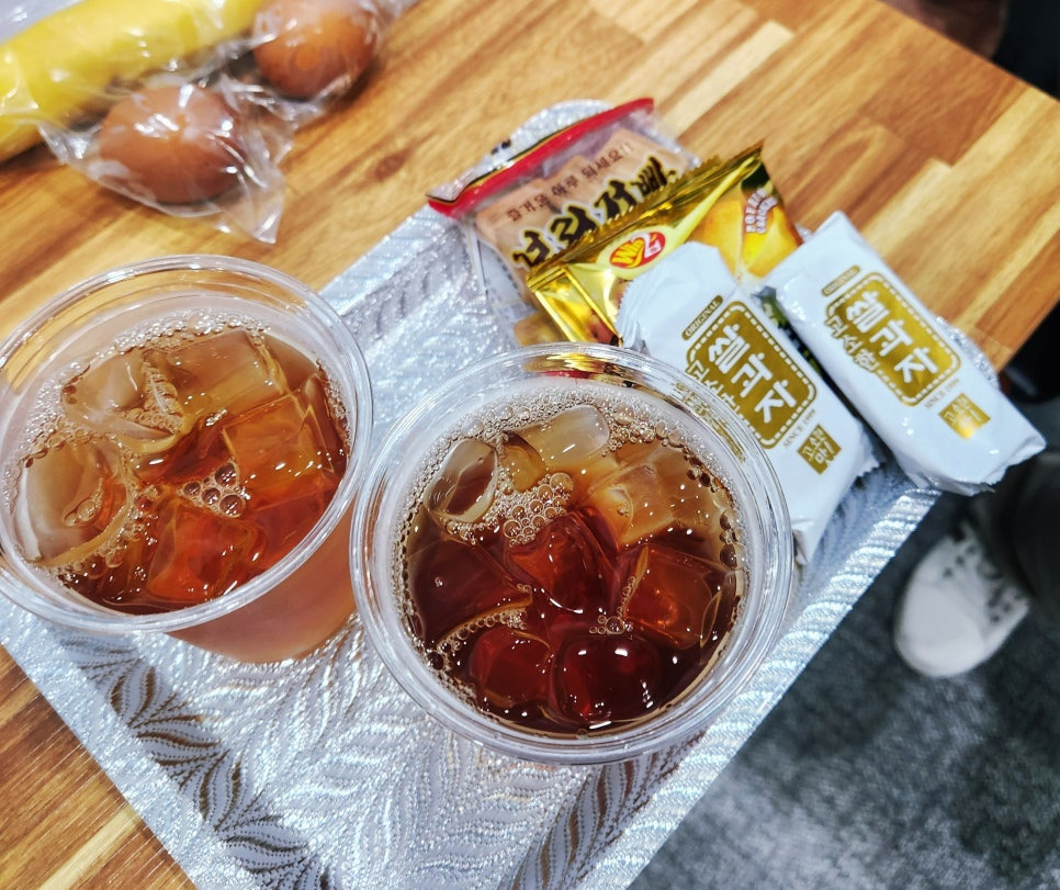 녹차, 아이스티, 커피 중 한잔 고를 수 있어요.