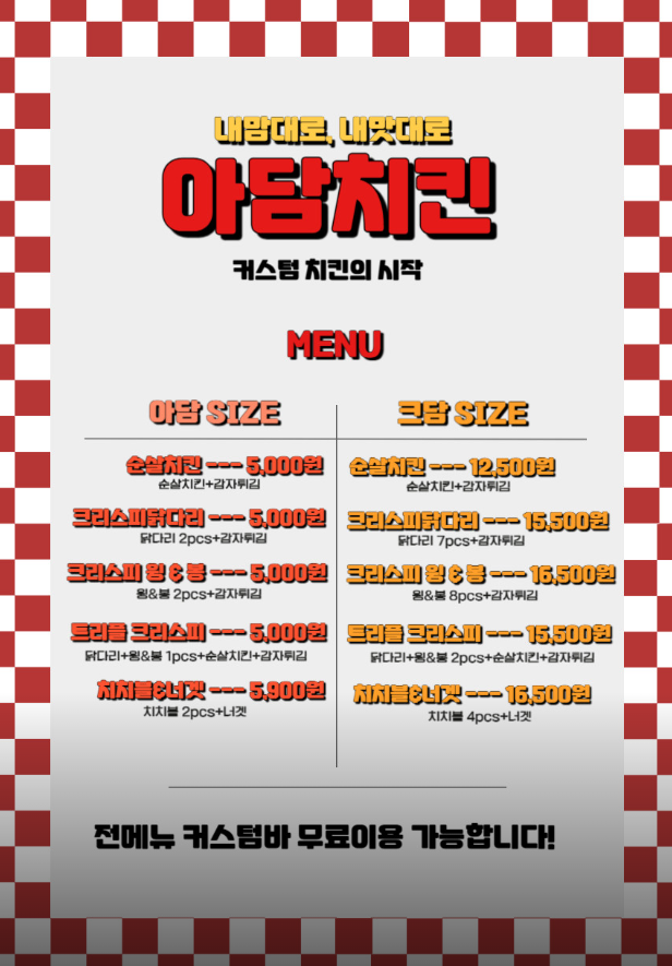 가.격으로 1인 치킨도 가능한 "아담치킨"