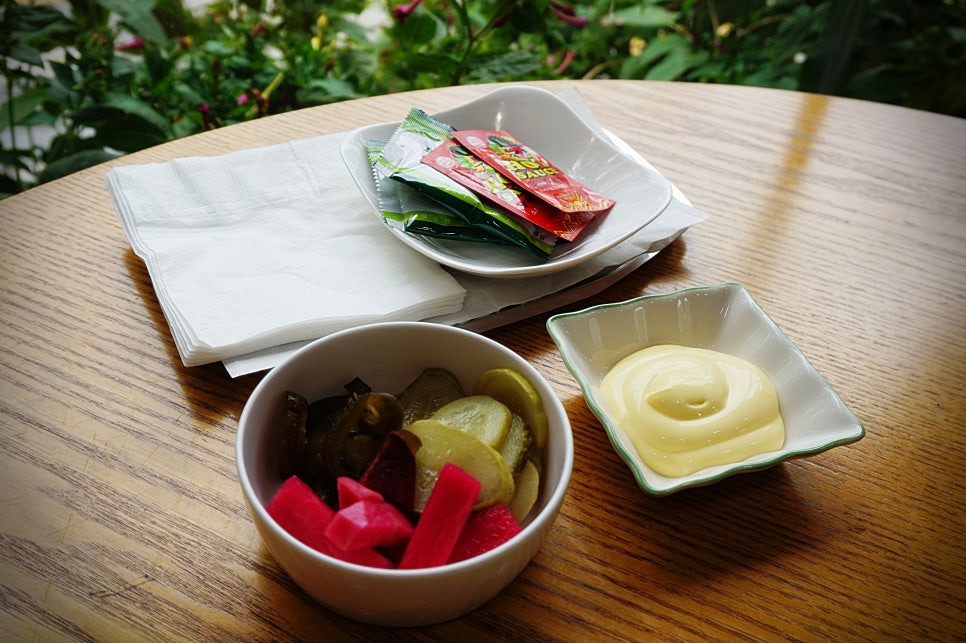 갈릭소스와 피클, 할라피뇨를 가져다주셨어요.