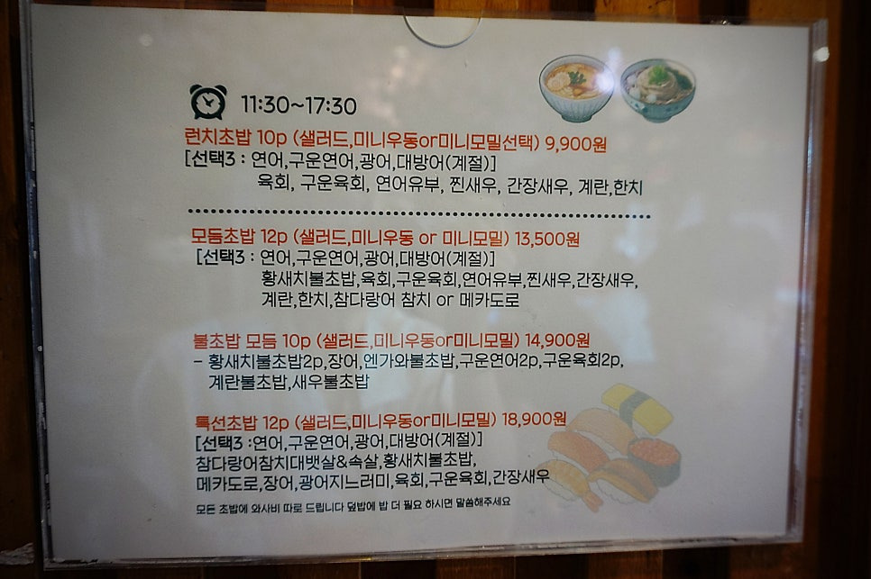 모든 초밥모듬에는 샐러드, 우동 또는 미니모밀까지