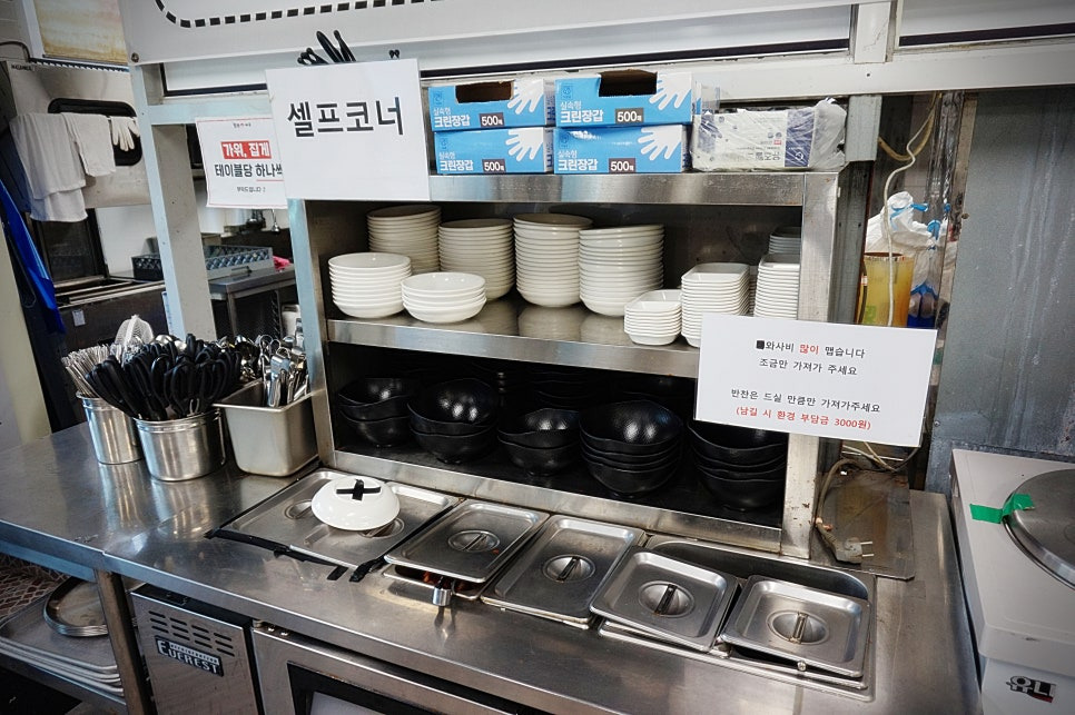 물은 셀프이고요. 식기, 앞접시, 쌈장, 김치 등은 셀프바에서 가져다 드시면 됩니다.