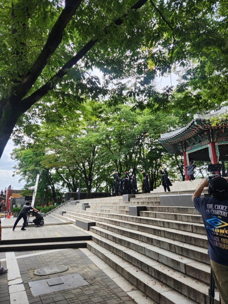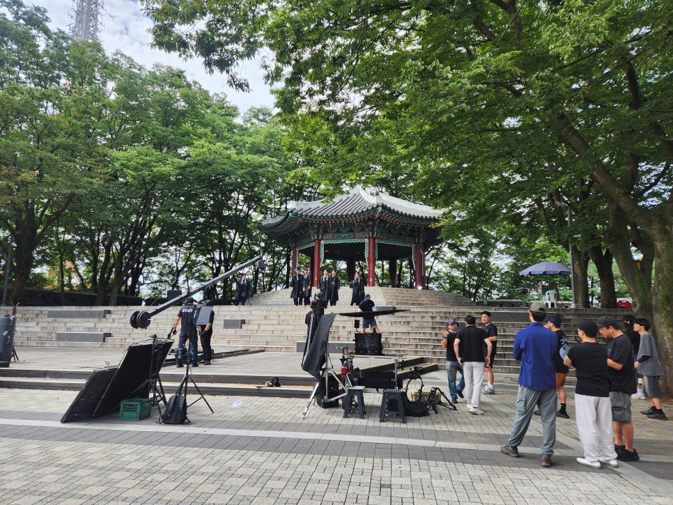요즘 케이팝 데몬헌터스가 유행이잖아요. 그거 관련해서 뮤직비디오를 찍는건지.. 저승사자 컨셉으로? 팔각정에서 촬영중.