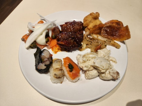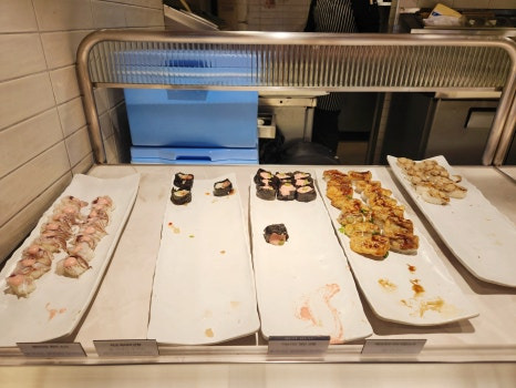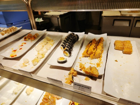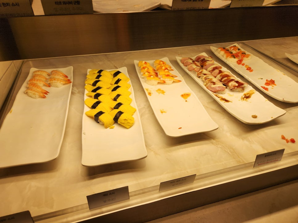 그리고 제가 제일 많이 먹었던 초밥. 롤도 있고, 연어회도 있었는데 연어회가 생각보다 맛있어서 많이 가져다 먹었음돠.
