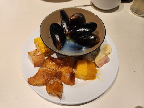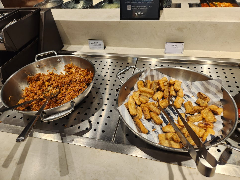 한식부터 일단 가봤어요. 두부김치, 잡채, 쫄면, 그리고 홍합탕, 미역국 등 있어요. 진짜 홍합탕 너무 맛있음.