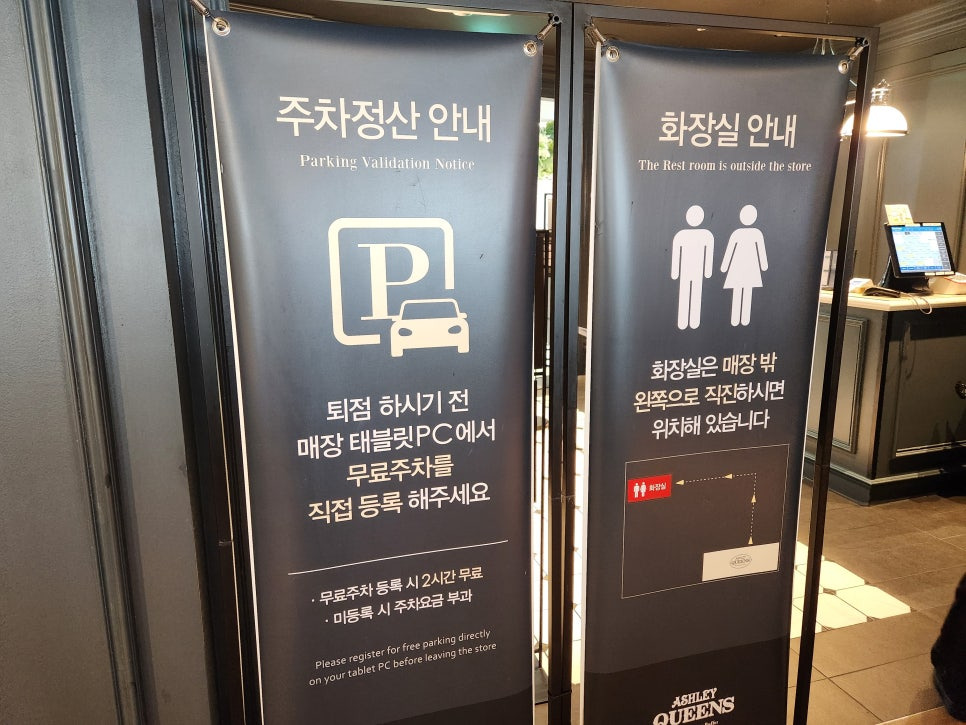 주차정산은 꼭 나가시기 전에 직접 등록해주셔야 하고, 화장실은 매장 밖에 있어요.