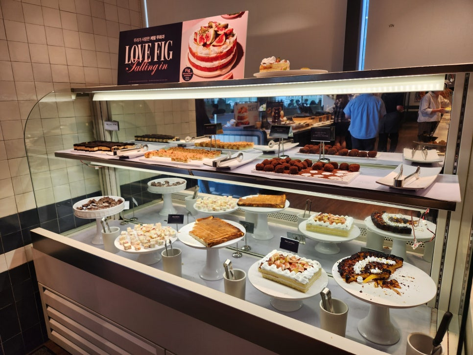 이제 디저트 보셔야죠?ㅎ 지금 무화과 시즌이라 쫀득쿠키, 케이크가 있구요. 치즈케이크, 시나몬크럼블바, 티라미수, 초콜릿이 있구요. 빠질 수 없는 커피머신기도 있어서 맛있는 디저트, 티타임을 즐겼어요.