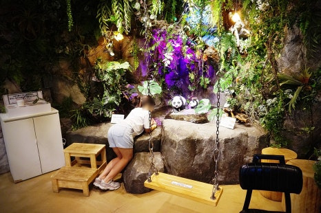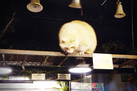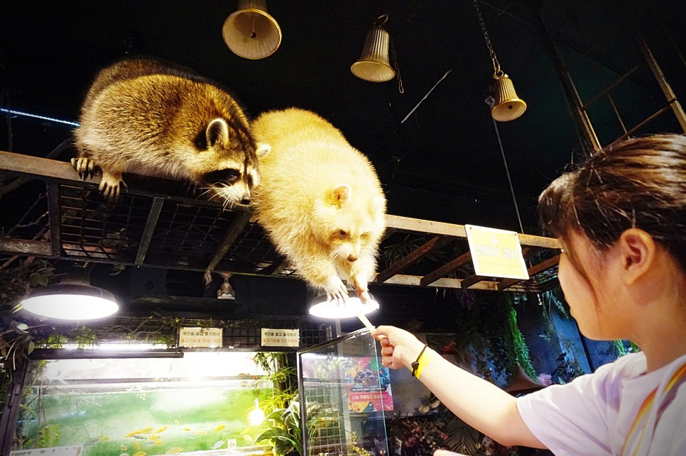 들어가보니 라쿤이 사다리 위에서 놀고 있었어요ㅋ 진짜 작은 곰느낌?ㅋㅋ 직원분이 간식주는 방법을 알려주셨어요.