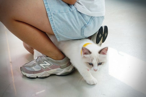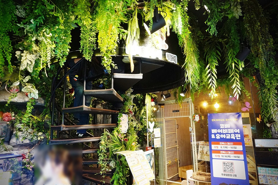 이제 충전 완료 ㅎㅎ 매장 한가운데 계단이 있는데, 그 계단을 올라가시면 고양이와 강아지를 만날 수 있어요.