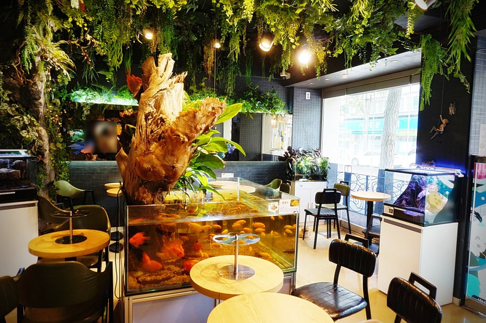 1층으로 들어가면 카페가 있어요. 수족관도 있고, 고양이들도 한두마리 돌아다니고 있어요 ㅎㅎ