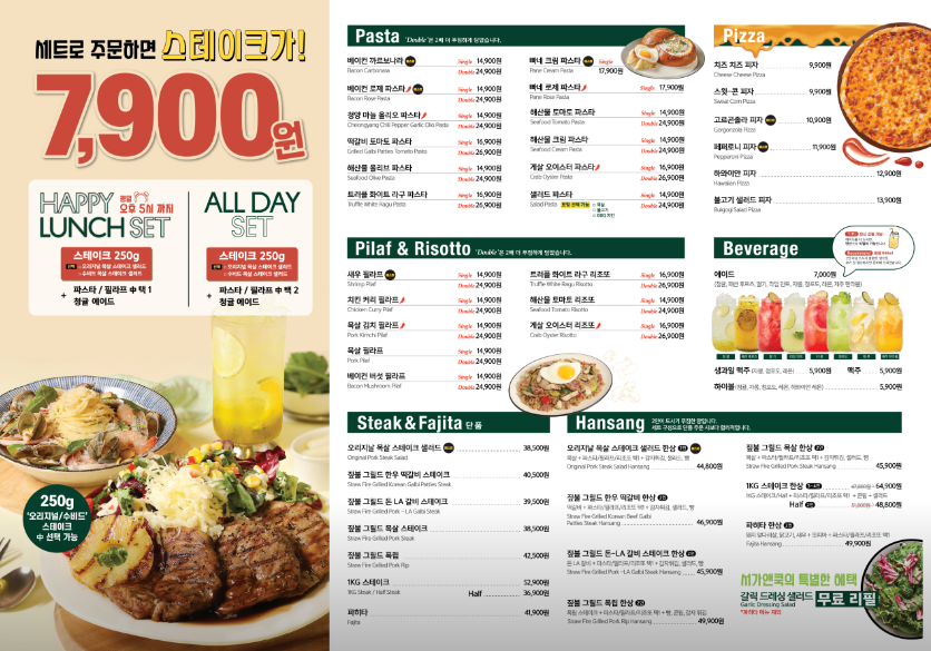 서가앤쿡에서 유명한 한상메뉴. 그리고 서가앤쿡의 특별한 해피런치 세트!! 세트로 주문하면 스테이크가 7,900원이라는 점.