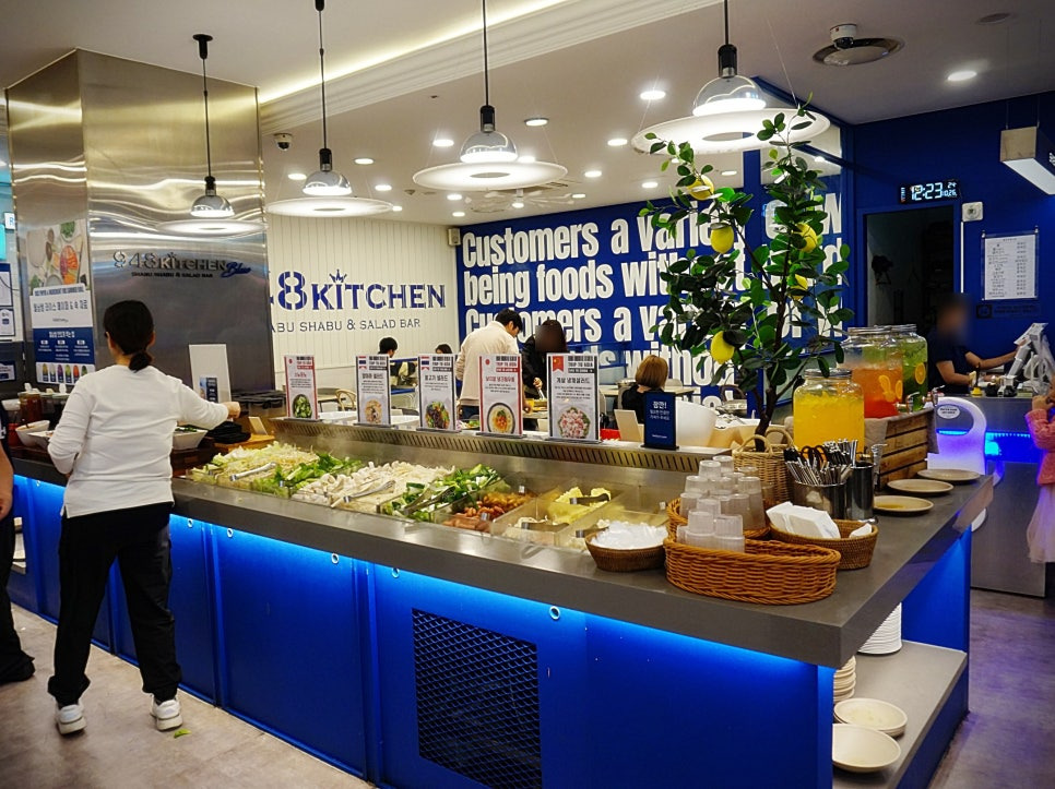 들어가는데까지 15분 정도 걸린 것 같아요. 948키친블루는 선결재라서 대기번호 확인 후 결제하시면 됩니다. 이용시간은 100분, 저희는 소고기 샤브 19,900원 저희 딸은 9,900원! 아이들은 정말 좋아합니다😜
