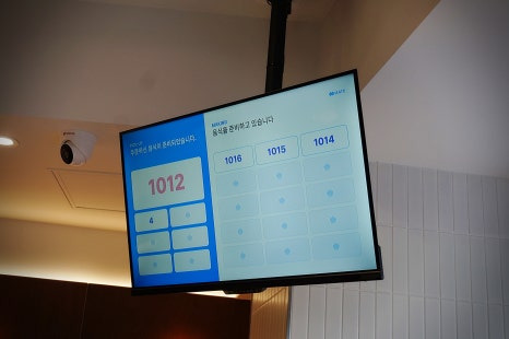주문이 들어가면 윗쪽 전광판에 번호가 나와요. 마치 푸드코트 같죠?ㅎㅎ 번호가 뜨면 픽업하러 가면 된답니다.