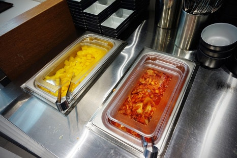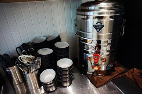 셀프코너에는 단무지, 김치, 그리고 뜨끈한 국물이 준비되어 있답니다. 정수기에 물도 셀프인데, 물병가져가셔도 됩니다. 전 물 많이 마셔서 ㅋㅋ
