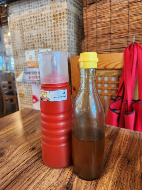 테이블에 참기름, 고추장이 놓여 있구요, 쌈밥 맛있게 먹는 방법도 있으니 참고해서 드시면 됩니다 ^^ 그냥 반찬 막 넣고 참기름 쏵, 고추장 쏵 뿌리고 먹어도 맛있어요 ㅋㅋ