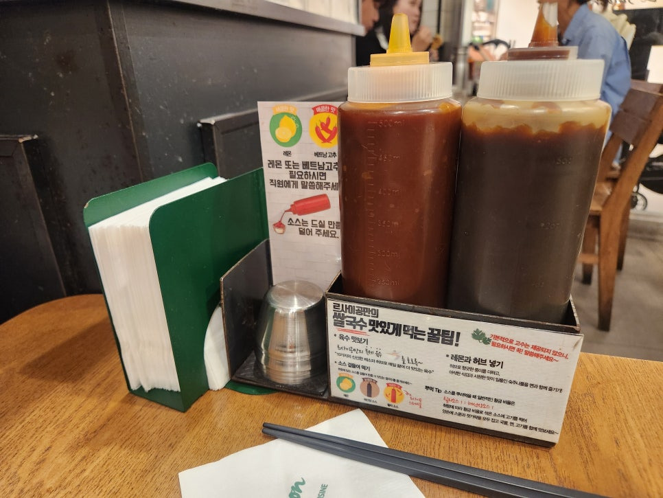 테이블에는 해선장과 칠리소스가 준비되어 있으니 필요한만큼 덜어드시면 됩니다. 레몬, 베트남 고추, 고수는 필요하시면 요청하기😊