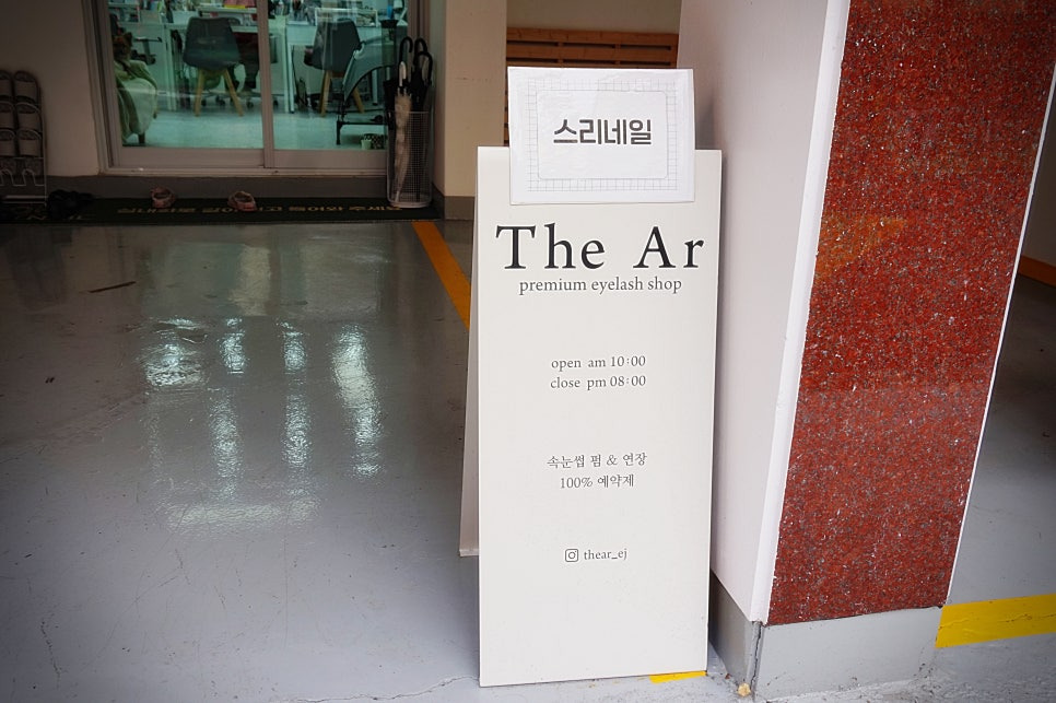 보통 속눈썹샵은 2, 3층이 대부분인데 1층에 있어서 편하더라구요. 계단없이 들어가구 ㅎㅎ 간판은 "스리네일"로 되어 있지만, 샵인샵이라 "더아르"도 여기 입구로 들어가시면 됩니다.