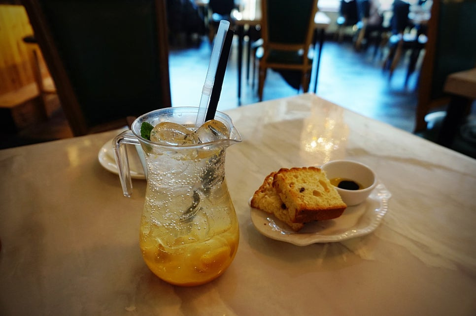 주문한 뒤 식전빵과 오렌지에이드가 나왔답니다. 식전빵은 폭신한 빵일 줄 알았는데 아주 바삭한 빵이었답니다. 가루 많이 흘림 ㅋㅋ
