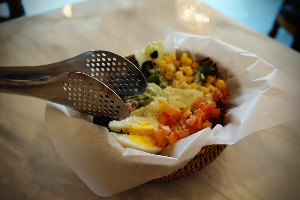 런치세트에 포함되어 있는 미니 샐러드. 미니라고 하기엔 양이 많았어요. 다양한 야채들과 토마토, 콘옥수수, 올리브, 계란 등 여러가지 들어가 있었답니다. 수제 허니머스타드 소스에 열심히 비벼서 저만 잘 먹었네용ㅋㅋ