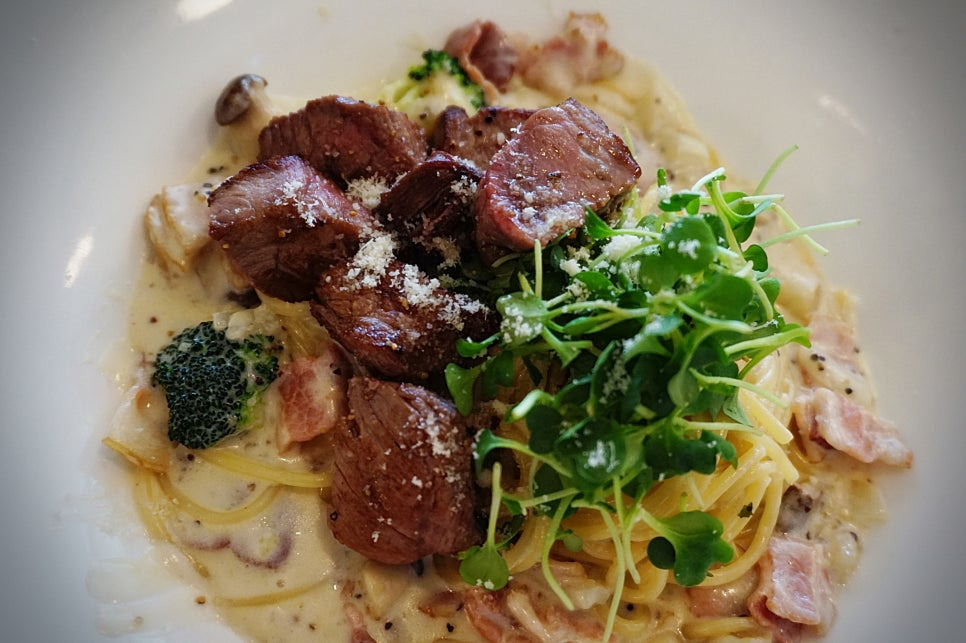 그릴에 구워낸 채끝등심을 얹은 크림파스타. 고기양이 파스타랑 반반.. 스테이크 시킬 필요가 없는 양이에요ㅋ