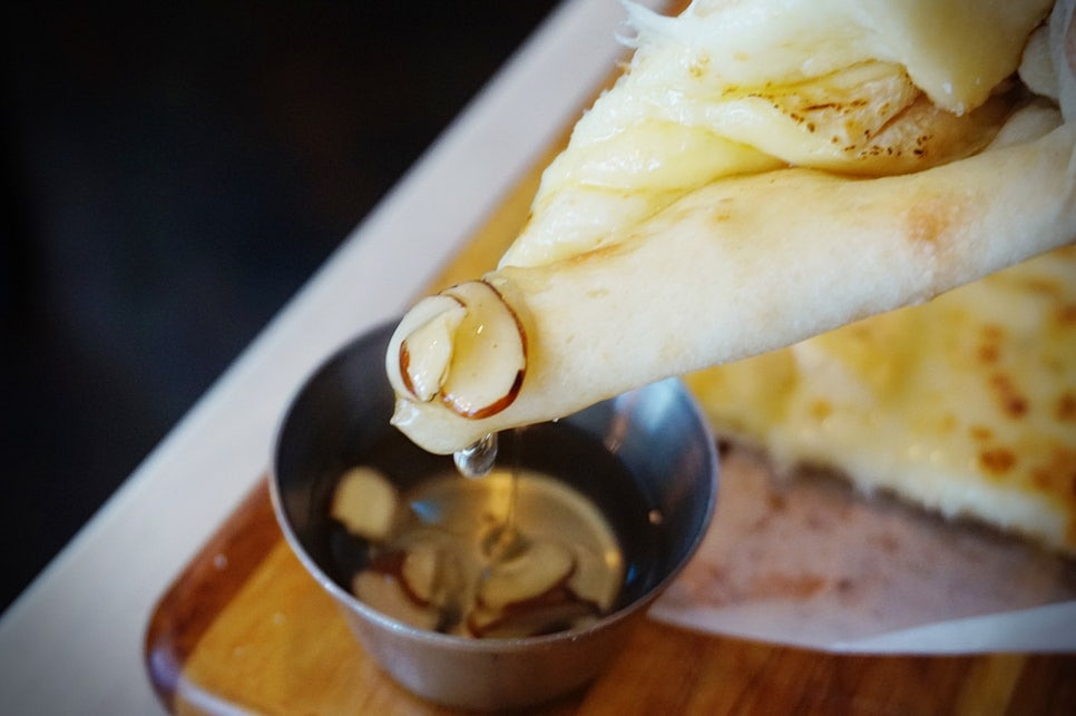 고급치즈의 풍미와 향연.. 꿀이 같이 나와서 찍으먹으면 정말 달콤하고 맛있어요. 치즈가 막 입에서 퍼지는 느낌. 고르곤졸라랑 비슷하긴 한데 더 쫄깃해요😊