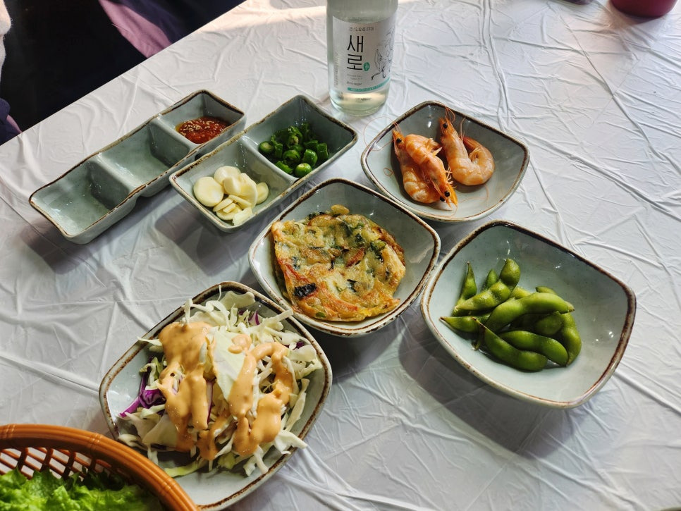 기본찬으로 나오는 메뉴들이랍니다. 새우도 맛있고, 강남콩도 달아요. 상추와 깻잎은 싱싱하구요. 무한리필 가능합니다. 셀프바에서 가져다 드시면 됩니닷. 1인 상차림 2천원 비용치곤 정말 괜찮은 곳이에요.