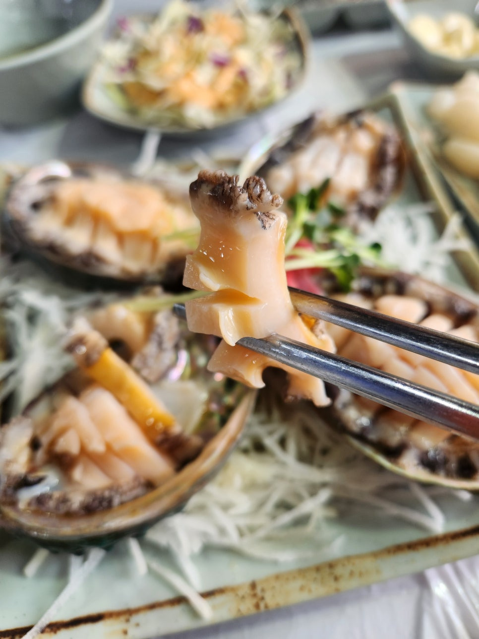 전복도 비린내 안나고 맛있어요. 직원분 말로는 원래 3개 나오는데 1개 더 주셨다고 하네용. 저번에 왔을 때도 4미였는데..;; 이제 3미 밖에 안주나봐요 ㅠㅠ 정말 싱싱하고 맛있는 전복💕