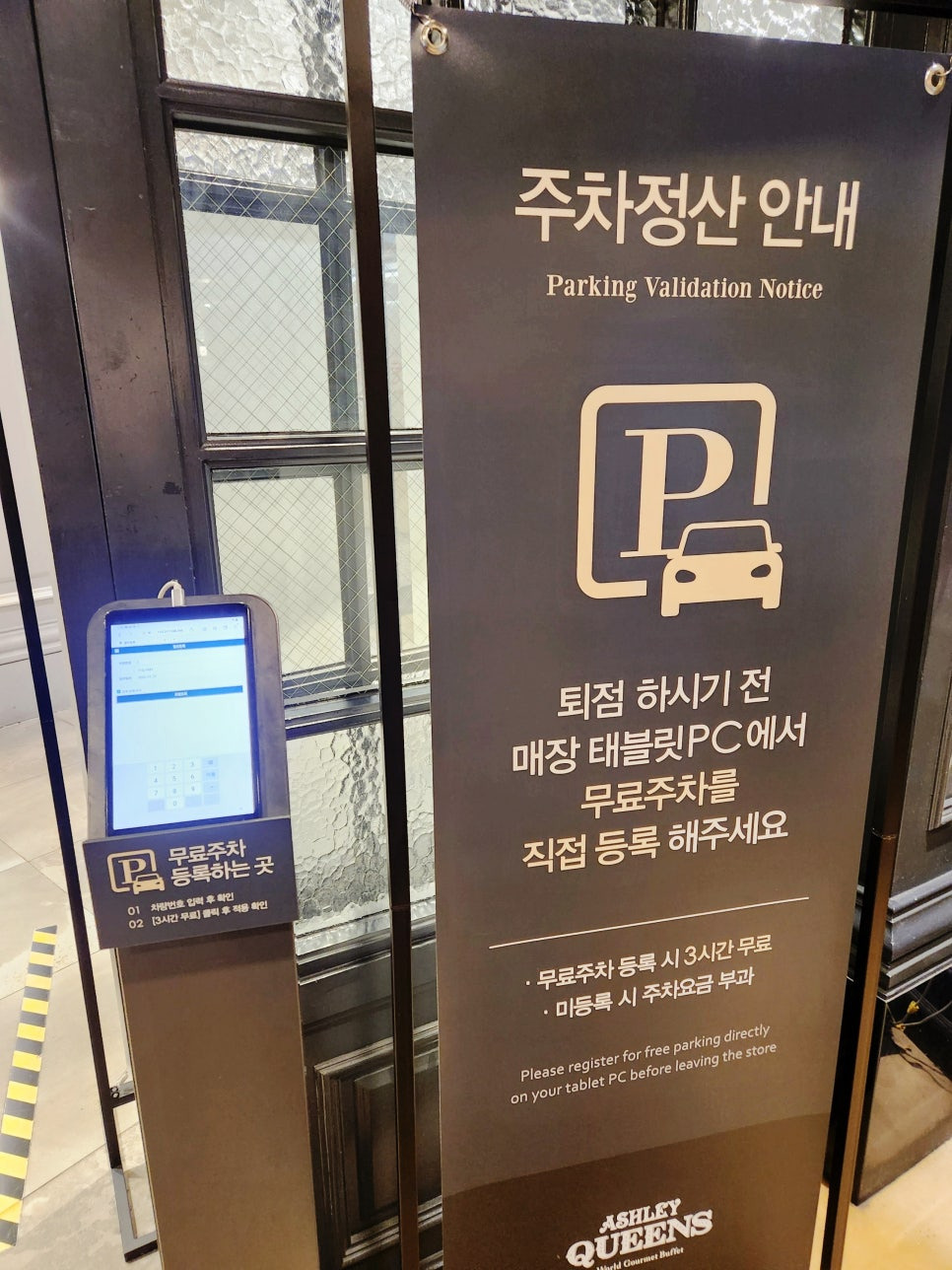 주차정산을 나갈때 테블릿으로 주차등록 하시면 됩니다. 무료 3시간이라 넉넉해요. 저희는 쇼핑도 하고 그래서 주차시간이 아~~주 넉넉하답니다. 가족들과 맛있게 식사도 하고, 쇼핑까지. 한번에 끝 ^^ 추천합니다🖐