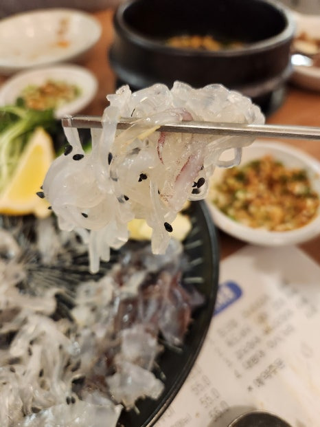 회가 나왔는데 스끼먹는다고 배가 넘 불러가지구ㅋㅋ 오징어 2마리는 들어간 것 같은데, 식감을 다양하게 느낄 수 있게 잘 썰어주셨어요. 얇게 썰어서 그런지 제가 맛보지 못했던 오징어식감... 잊을 수가 없어요. 또 먹고 싶어 ㅠㅠ 오징어는 몇 번 집어먹으니 금새 없어져버림😅