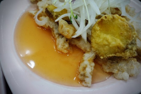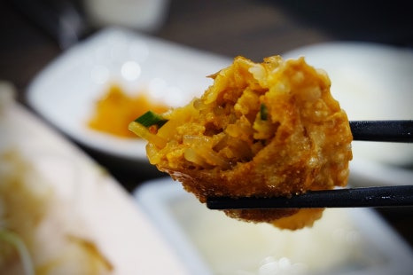 찹쌀반죽으로 뽀얀 튀김옷, 겉은 바삭하고 속은 쫄깃한 식감. 그리고 튀김고구마도 들어있는데 맛있다고 아이가 두개다 홀릭. 너무해 >.<