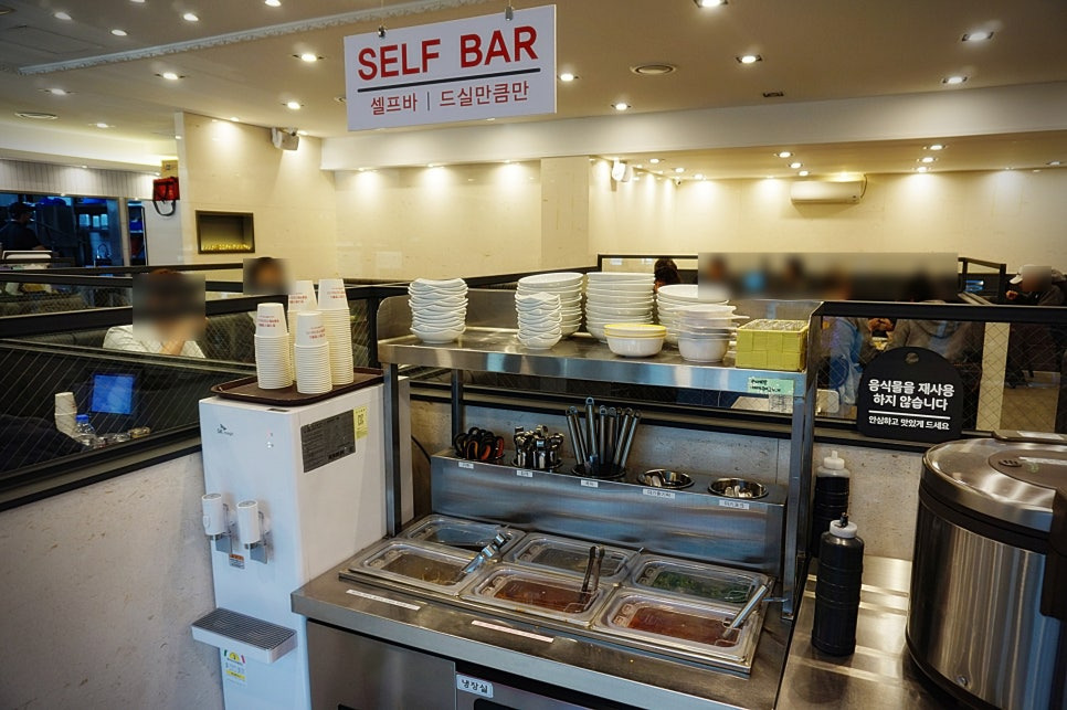 테이블엔 생수 1병, 짜사이, 단무지, 식초, 간장, 고춧가루가 있어요. 더 필요하신건 셀프코너에서 ^^