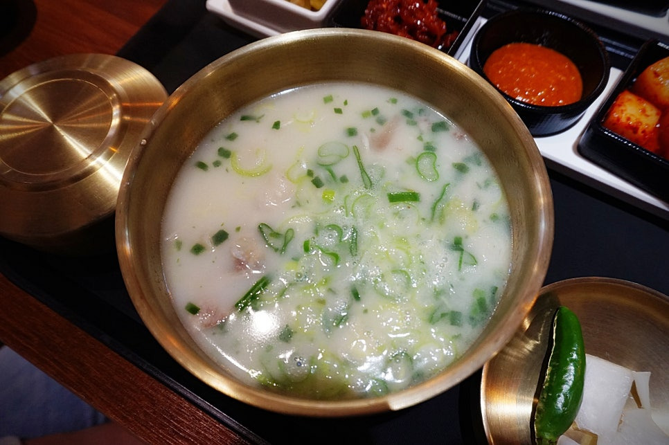 저희 아이가 주문한 돼지국밥. 뽀얀 국물에 여러가지 기본찬까지. 한상 너무 맘에 듭니다.