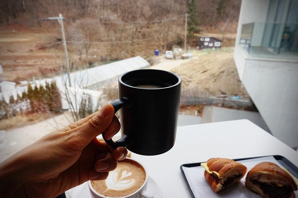 들어가자마자 빵냄새가 맛있게 풍겼어요. 사실 산자락에 있어서 사람들이 많이 없을 줄 알았는데 왠열;; 부모님 모시고 정말 많이들 오시더라구요. 핫한 카페였음!! ㅎㅎ