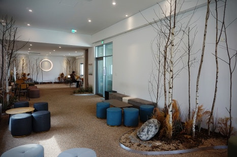 본관에서 다리를 건너 별관으로 오면, 1층은 사진이 없지만, 대형스크린과 음악을 감상할 수 있는 곳이 있구요. 2층은 가을느낌의 자작나무 조경 인테리어로 포근한 느낌의 공간이랍니다. 공간이 커서 유모차가지고 들어오신 손님들도 계셨어요.