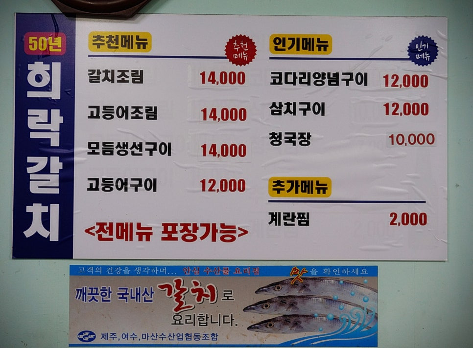 시장이라 가.격도 합리적. 그리고 국내산 갈치사용. 그게 킥이죠!! ㅎㅎ 계란찜은 서비스로 나오니 혹시 먹고 부족하시면 시키시면 됩니다. 저희는 갈치조림2, 고등어구이 1 주문!!