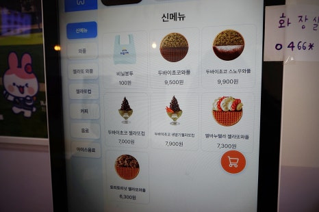메뉴가 너무 많아서 뒤에 기다리시는 분들도 많아 찍지 못했어요;ㅋㅋ 신메뉴만 찍었답니다. 두바이 초코와플 먹을까 했는데 아이가 두쫀쿠와플은 별로 안땡기다고 해서 다른걸로 주문.