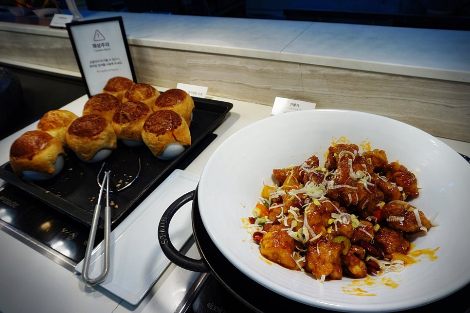 팔보채, 볶음밥, 탕수육, 깐풍기 중식종류. 와.. 불쇼도 보구 눈도 즐거웠어요. 저 페스츄리안에 스프들어있는 이름모를.. 저거 정말 맛있음!!