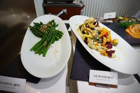 샐러드와 가리비 찜. 가리비찜 좋아하는데 들어갈 배가없음.